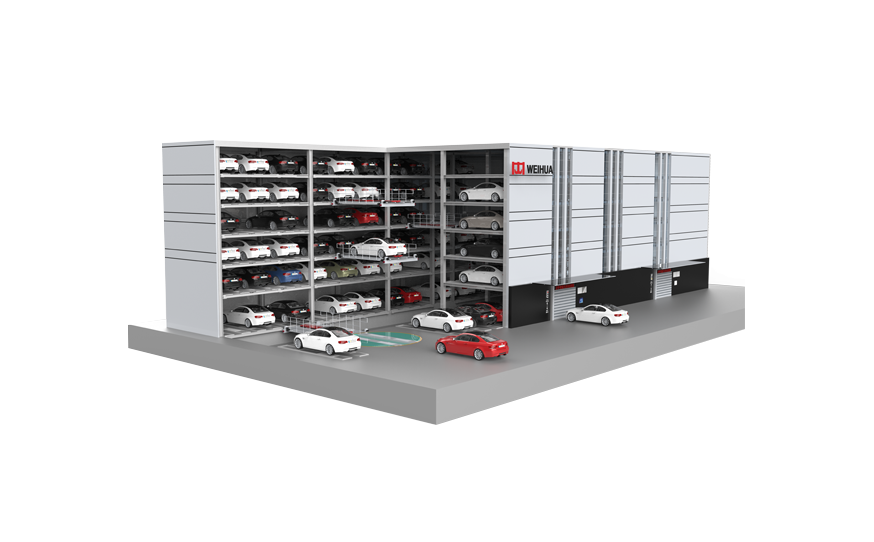 主要用于半地下、地上有高度空間且中間層面可做他用。每層至少一臺橫移車負責本層的車輛存取,由升降機將不同的停車層與入庫室相連,車輛只需停到入庫室,系統(tǒng)自動完成存取。該類車庫適用于地下和建筑內部,本設備可以滿足地上或地下從2層車庫到10層車庫的使用要求,實現(xiàn) 自動化快速安全存取車。
