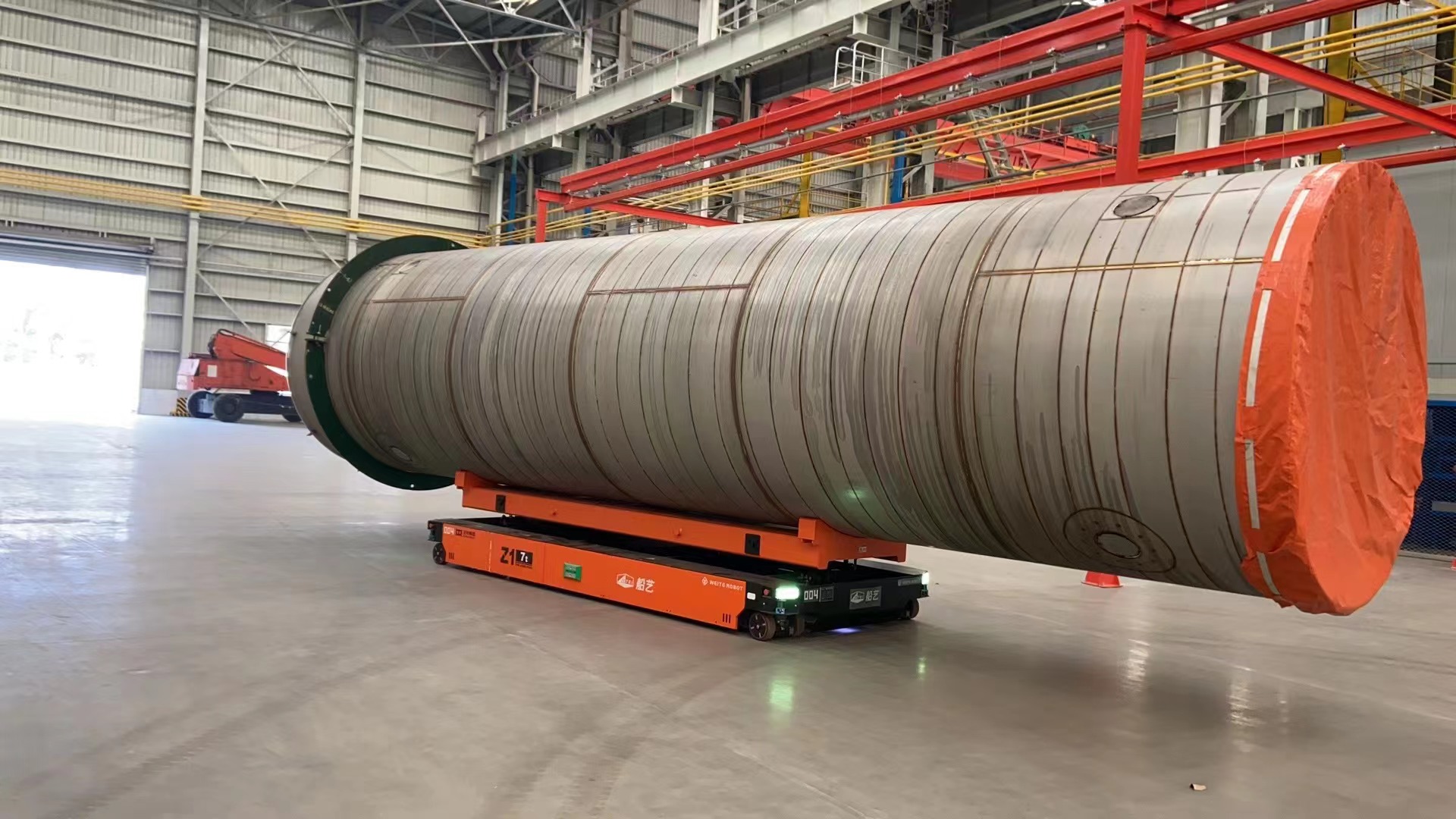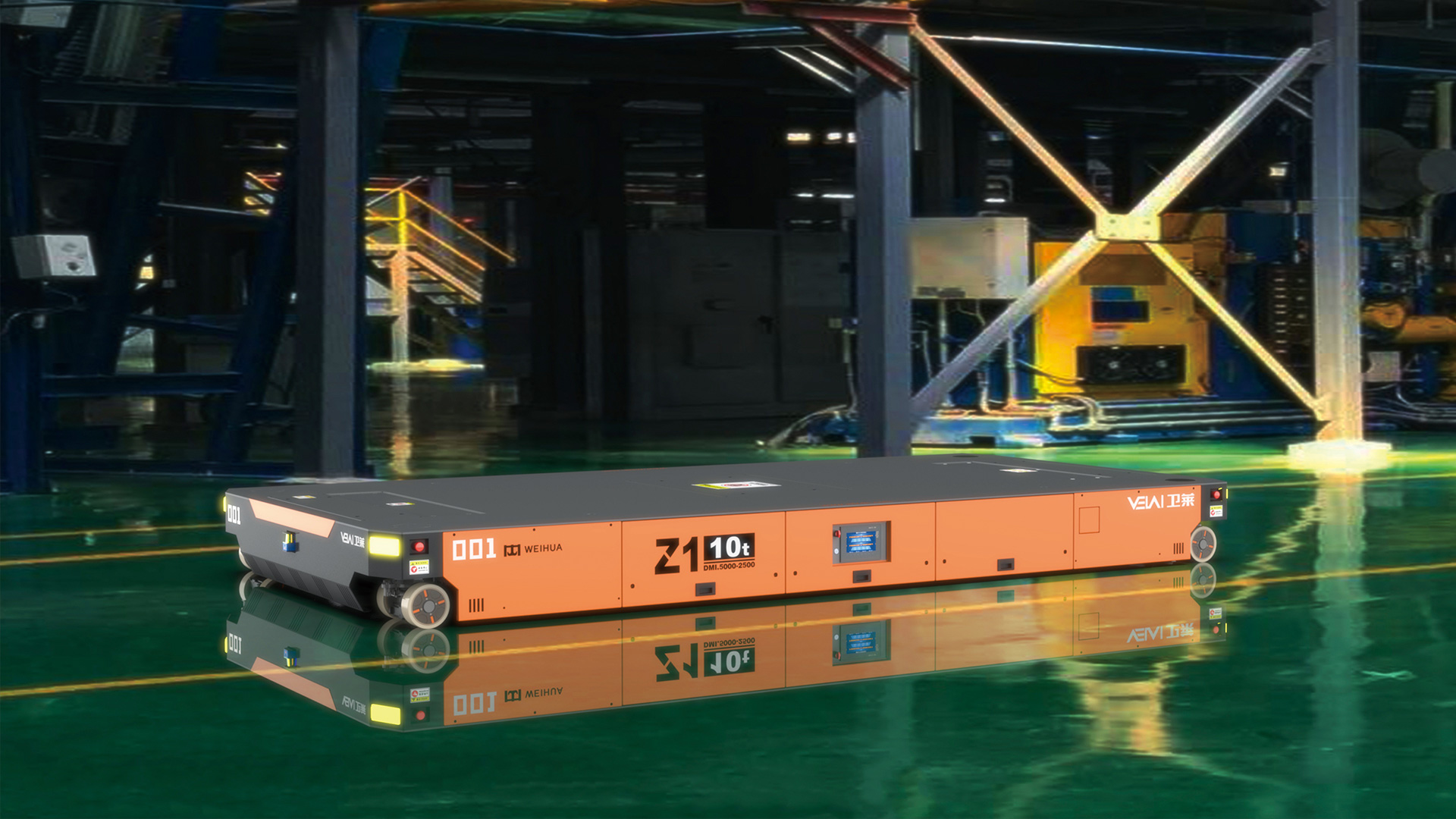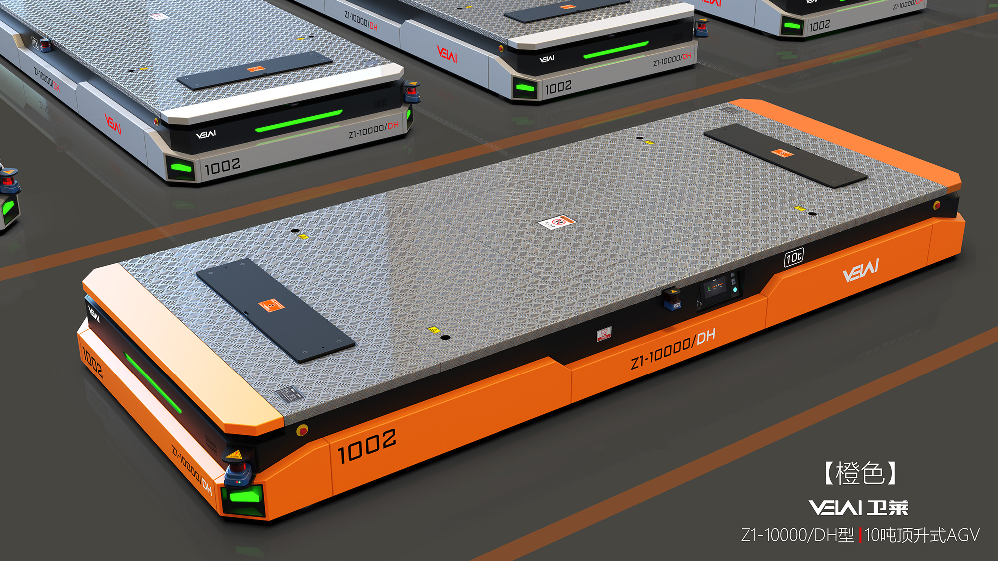 Z1-10t 型重載 AGV,可提供單車 10t 的負(fù)載能力,具有原地轉(zhuǎn)彎和橫移功能,特別適合用于大尺寸、大噸位工 件的運(yùn)輸。可在瀝青、自流平、混凝土地面上運(yùn)行,具有很強(qiáng)的地面條件適應(yīng)能力。由于其自身具有整車自頂升 功能,除可用于直接承載工件外,還可通過鉆入工件架并進(jìn)行自頂升,托舉工件架后間接承載工件。根據(jù)用戶要 求,多 AGV 可實(shí)現(xiàn)同步聯(lián)動(dòng),用于托舉大型部件。采用 PGV+ 二維碼的復(fù)合導(dǎo)航模式全自動(dòng)運(yùn)行,也可以遙控 運(yùn)行。