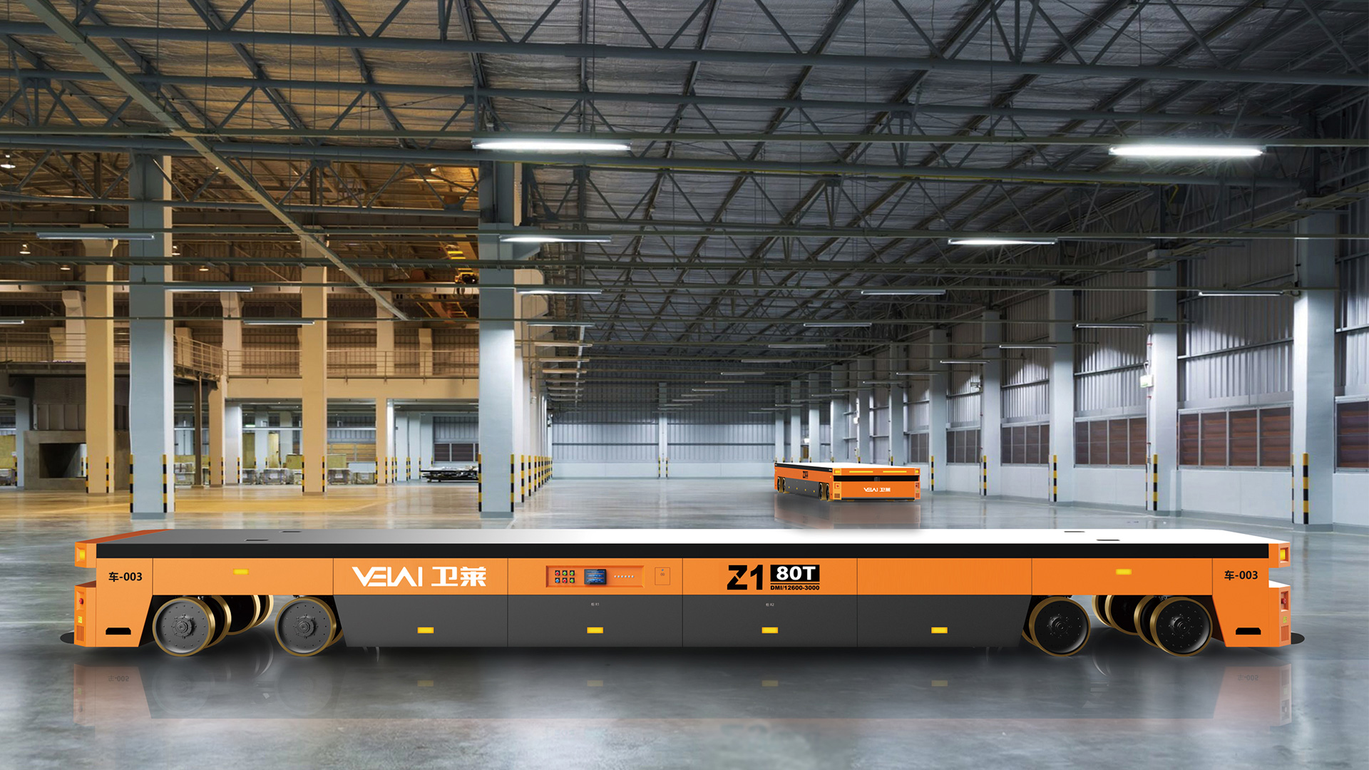 Z1-80t 型重載 AGV,可提供單車 80t 的負(fù)載能力,具有原地轉(zhuǎn)彎和橫移功能,特別適合用于大尺寸、大噸位工 件的運(yùn)輸。可在瀝青、自流平、混凝土地面上運(yùn)行,具有很強(qiáng)的地面條件適應(yīng)能力。由于其自身具有整車自頂升 功能,除可用于直接承載工件外,還可通過鉆入工件架并進(jìn)行自頂升,托舉工件架后間接承載工件。根據(jù)用戶要 求,多 AGV 可實(shí)現(xiàn)同步聯(lián)動(dòng),用于托舉大型部件。采用 PGV+ 二維碼的復(fù)合導(dǎo)航模式全自動(dòng)運(yùn)行,也可以遙控 運(yùn)行。